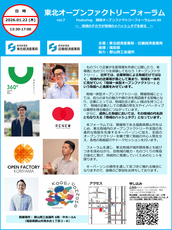 1月22日に東北経済産業局・近畿経済産業局主催の「東北オープンファクトリーフォーラムvol.7」が郡山で開催されました。
